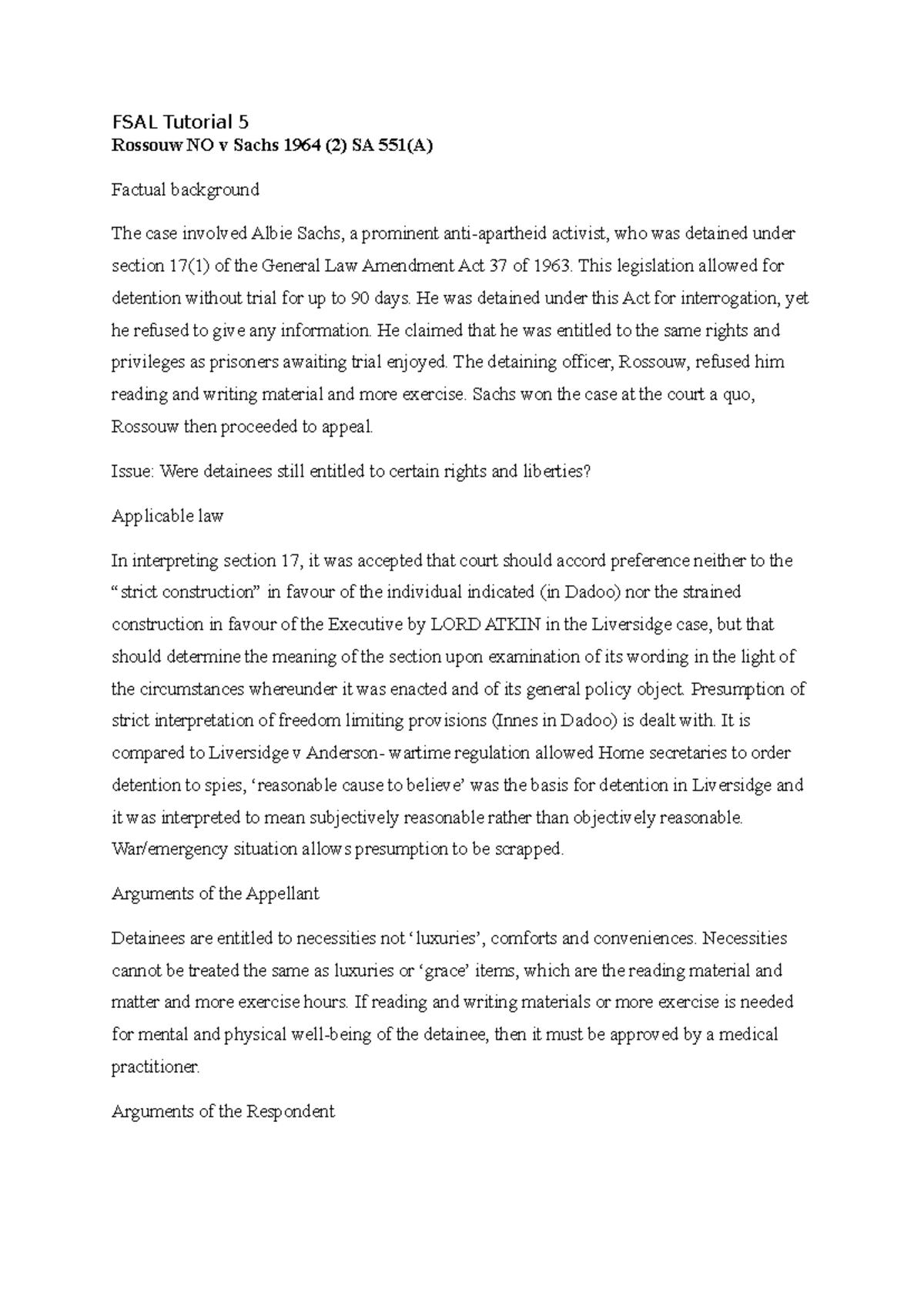 FSAL tut 5 - Tutorial workings - FSAL Tutorial 5 Rossouw NO v Sachs ...