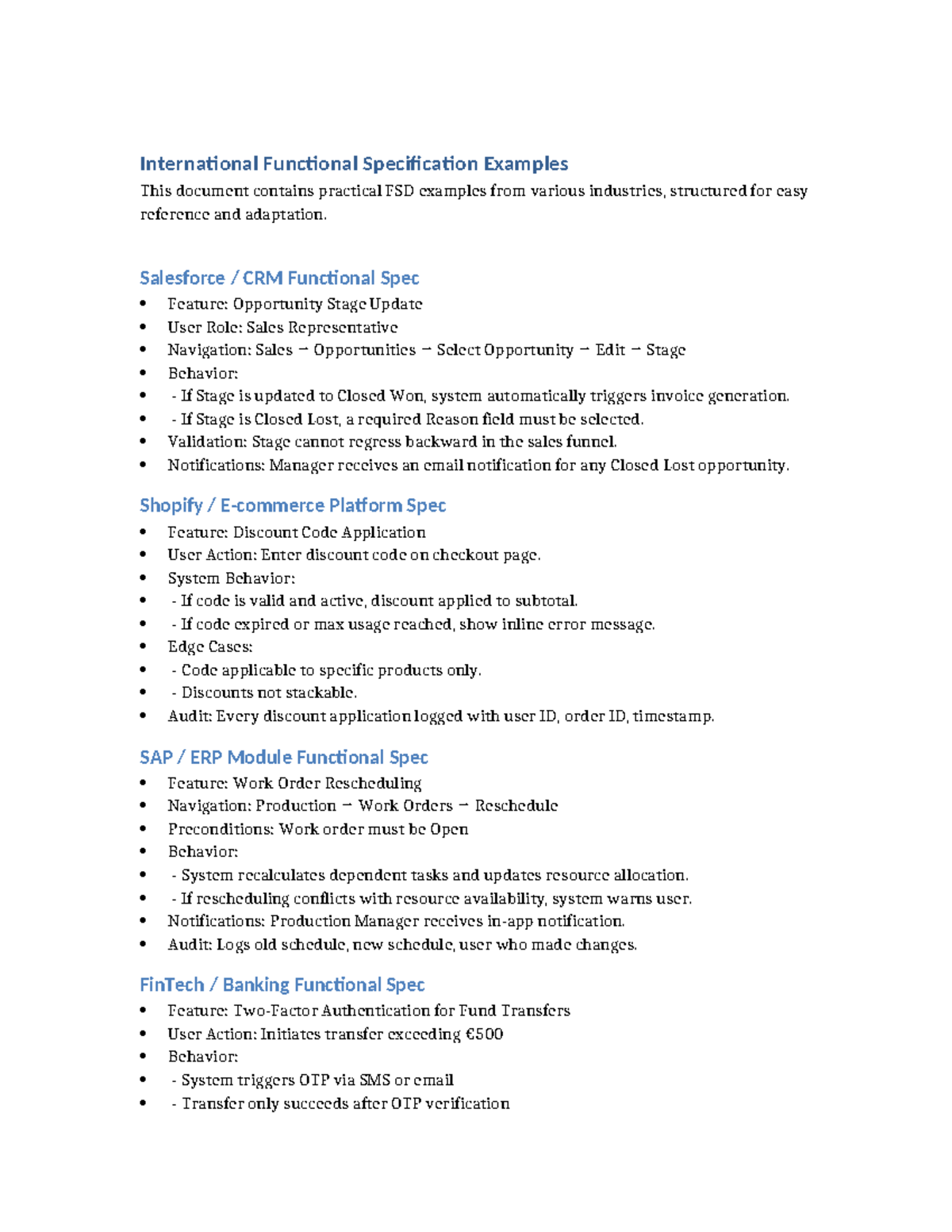 International FSD Examples: Practical Specs Across Industries - Studocu