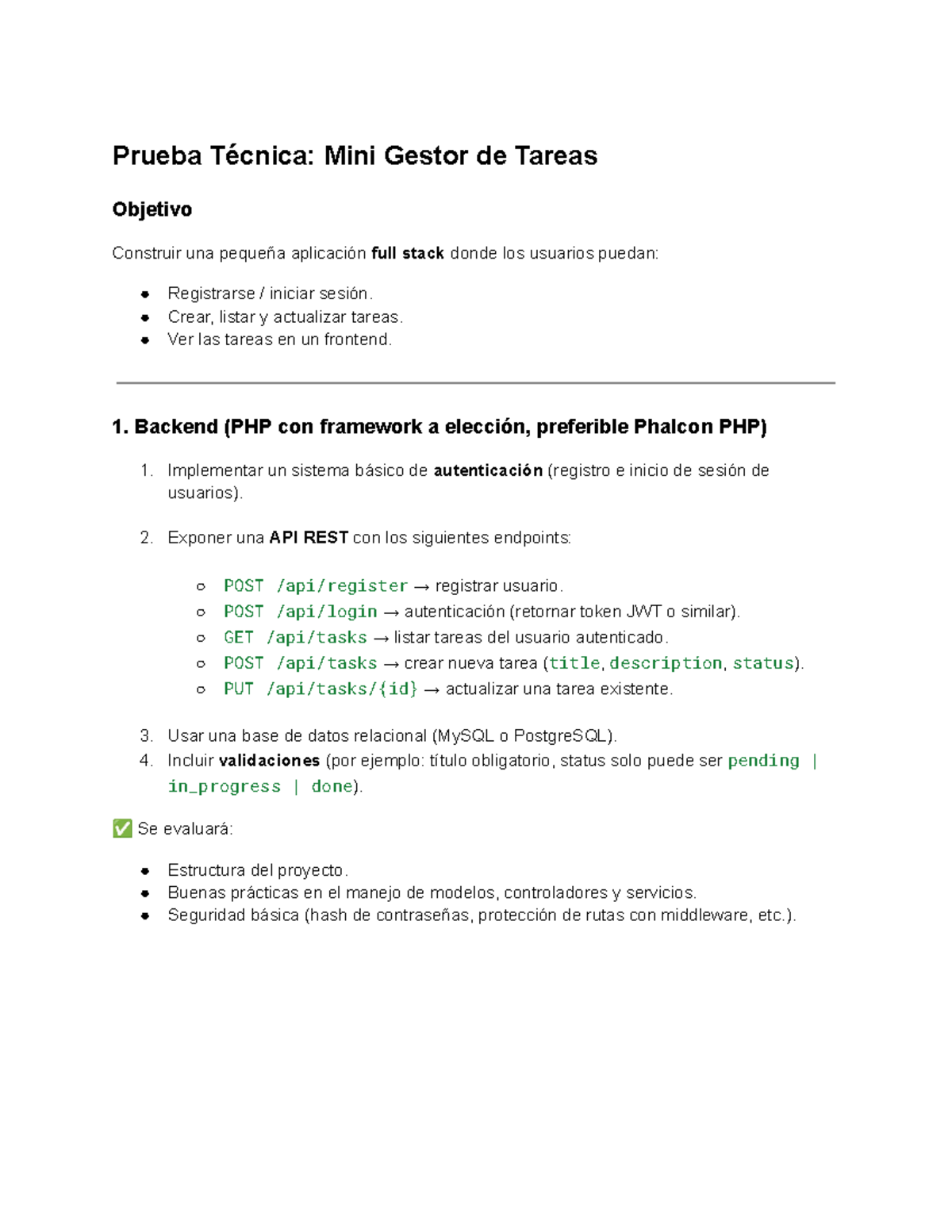 Prueba Técnica: Mini Gestor de Tareas Full Stack Development - Studocu
