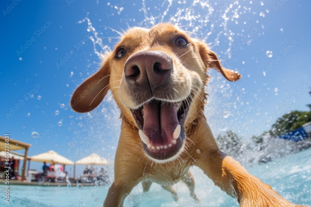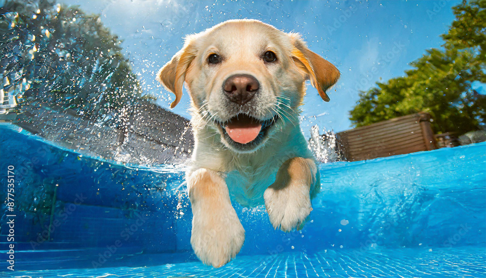 Golden Labrador retriever puppy playing joyfully in a swimming pool ...