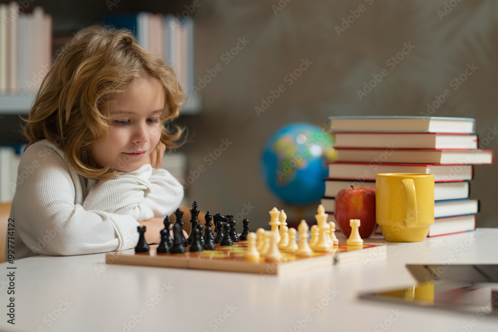 Child boy developing chess strategy, playing board game. Intelligent ...