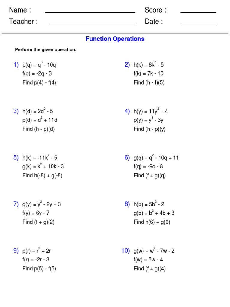 Math Function Operations Worksheet | PDF