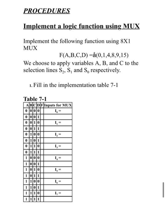 Solved PROCEDURES Implement a logic function using MUX | Chegg.com
