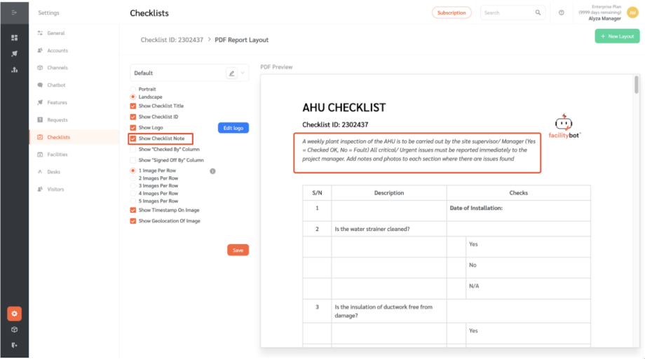 Checklist PDF Layout Editor - FacilityBot - Facilities Management Software