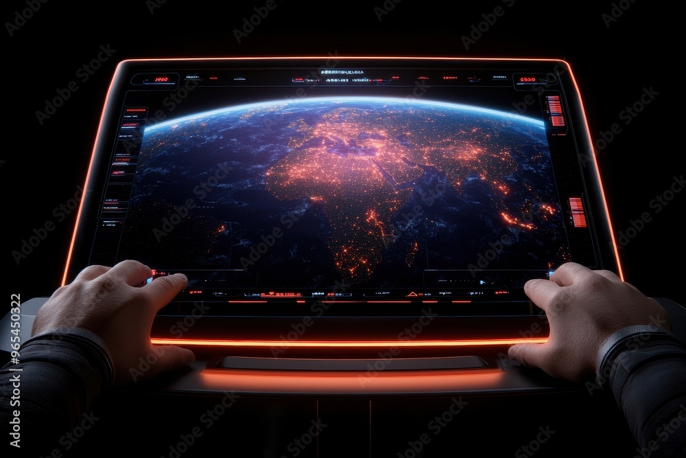 A futuristic interface displaying a digital map of Earth with glowing ...