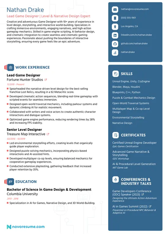 Game Designer Resume Example [Tips & Templates for 2025] | Novoresume