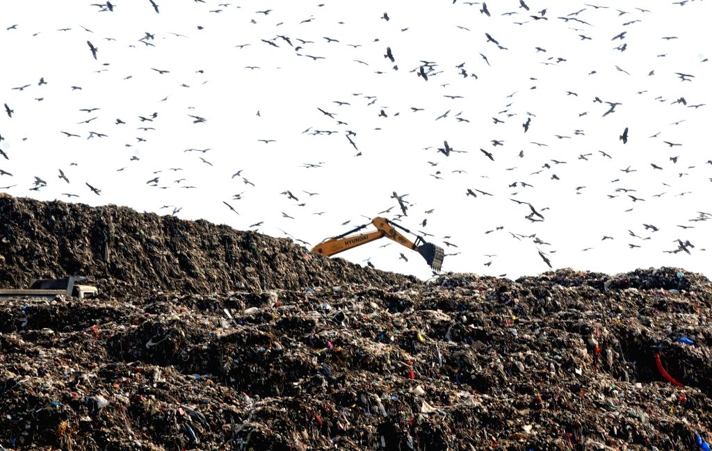 Premium Photo | A pile of garbage with birds flying around it and a ...
