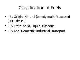 Classification of Fuels The kinds of fuels are classified into Solid, Liq..