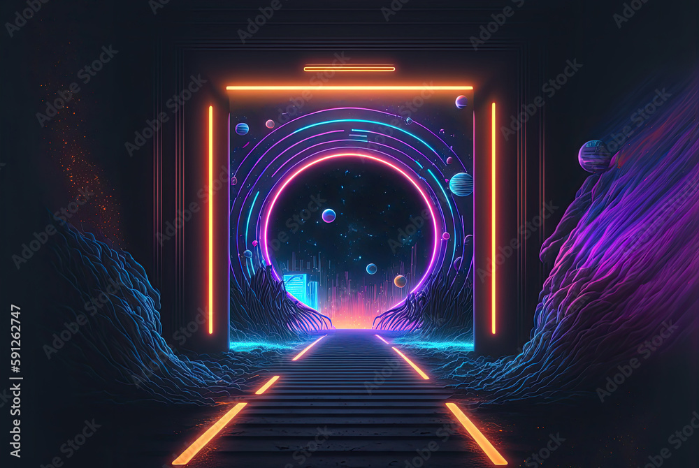 Neon light tunnel with glowing gate frame leading to a futuristic city ...