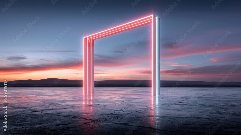 Futuristic neon light gate on expansive salt flats at sunset. Vivid ...