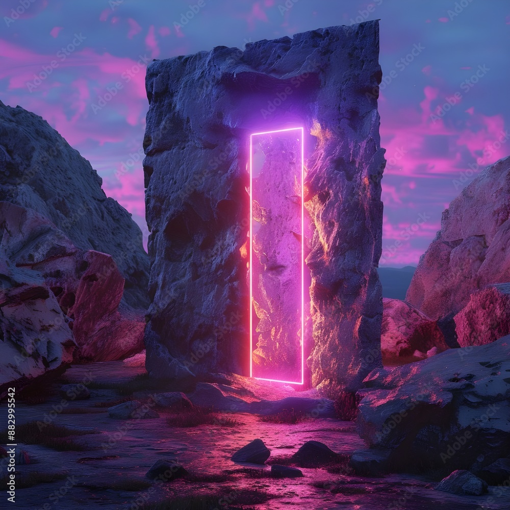 Magic Stone Gate With Neon Glowing Light Amidst Cosmic Landscape ...