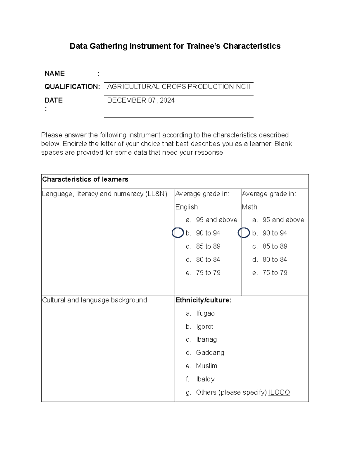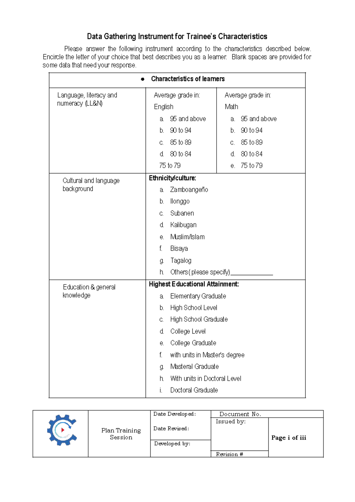 Data Gathering Instrument for Trainee Characteristics - Encircle the ...