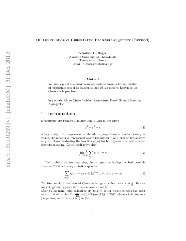 (PDF) On the Solution of Gauss Circle Problem Conjecture (Revised)