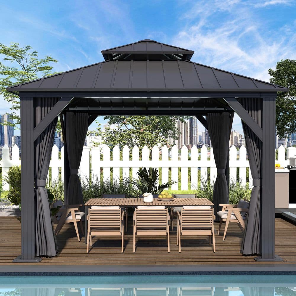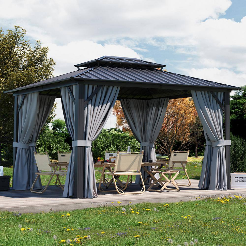 Sizzim 10 ft. x 12 ft. Hardtop Outdoor Double Roof Gazebo with Netting ...