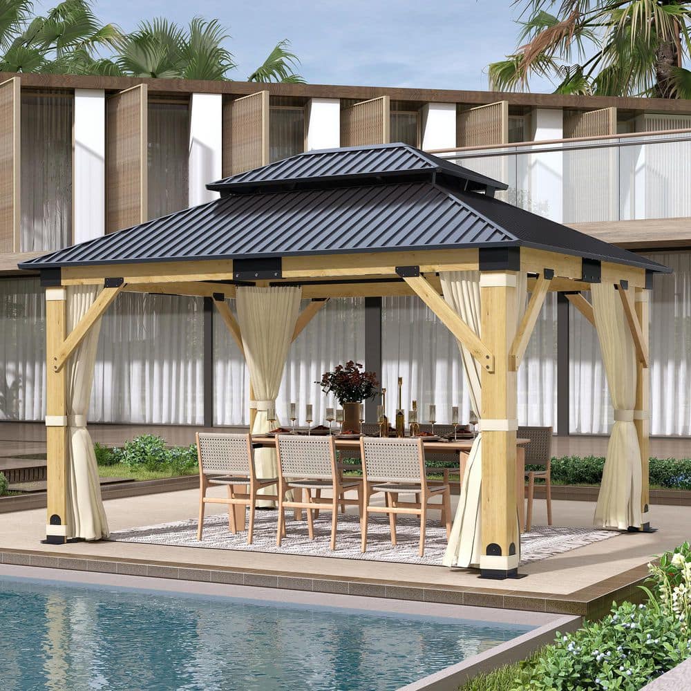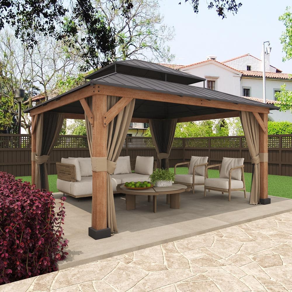 Esunny 14 ft. x 12 ft. Outdoor Patio Wood Frame Gazebo with Black Hard ...