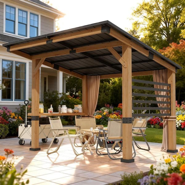 JOYSIDE 11 ft. x 11 ft. Outdoor Wood Grain Aluminum Patio Gazebo with ...