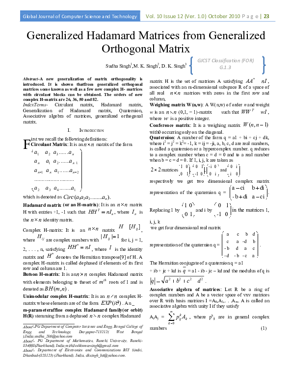 (PDF) Generalized Hadamard Matrices from Generalized Orthogonal Matrix