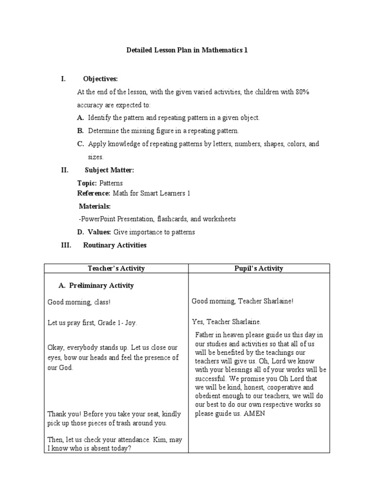 Detailed Lesson Plan in Math 1 - Repeating Patterns | PDF | Lesson Plan ...
