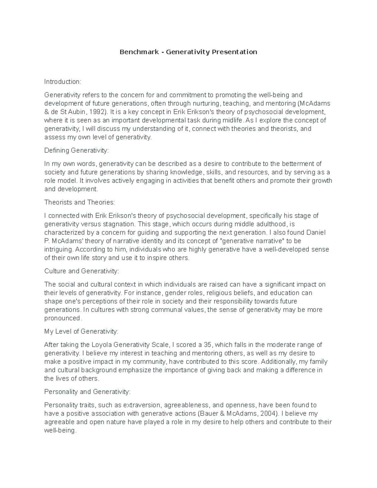 PSY 302 - Benchmark: Exploring Generativity & Its Impact on Society ...