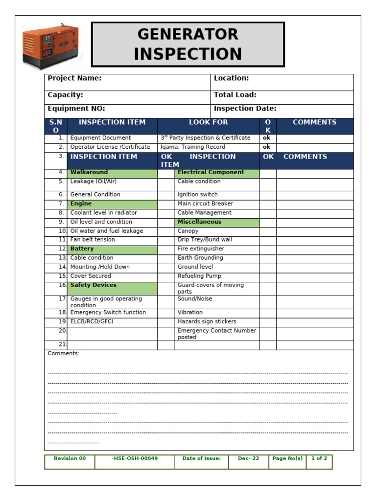 Generator Inspection Checklist - Generator Checklist - Power Generator ...
