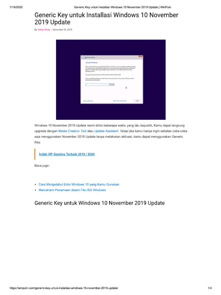 Generic Key Untuk Installasi Windows 10 November 2019 Update | PDF