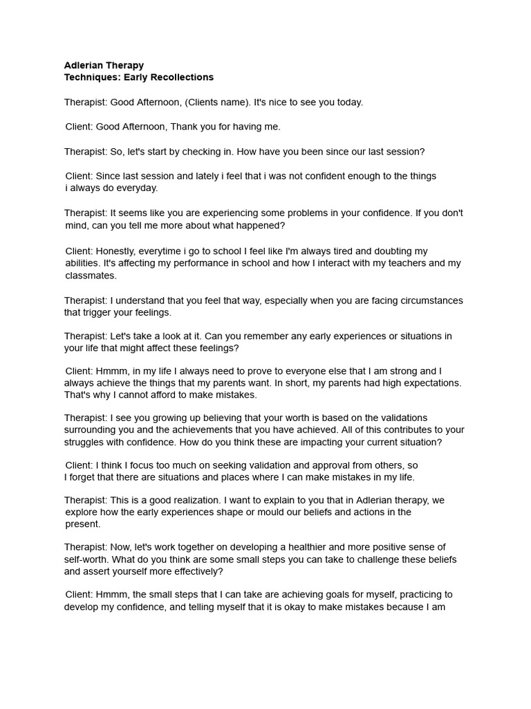 Adlerian Therapy Sample Script (Day 1) | PDF | Psychotherapy | Feeling