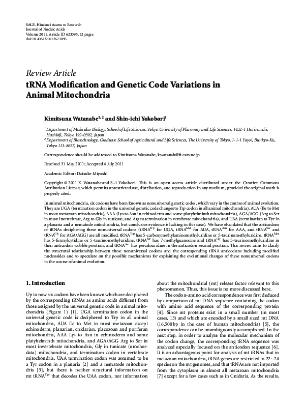 (PDF) tRNA Modification and Genetic Code Variations in Animal Mitochondria