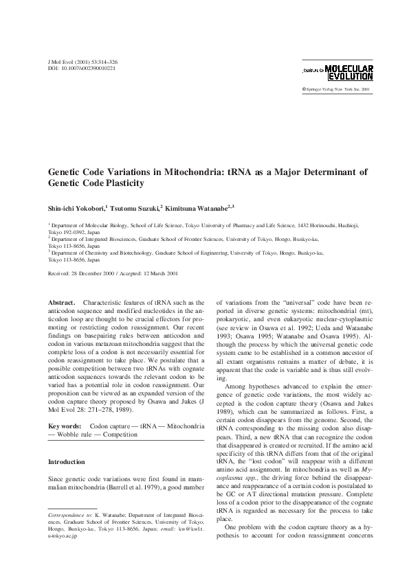 (PDF) Genetic Code Variations in Mitochondria: tRNA as a Major ...