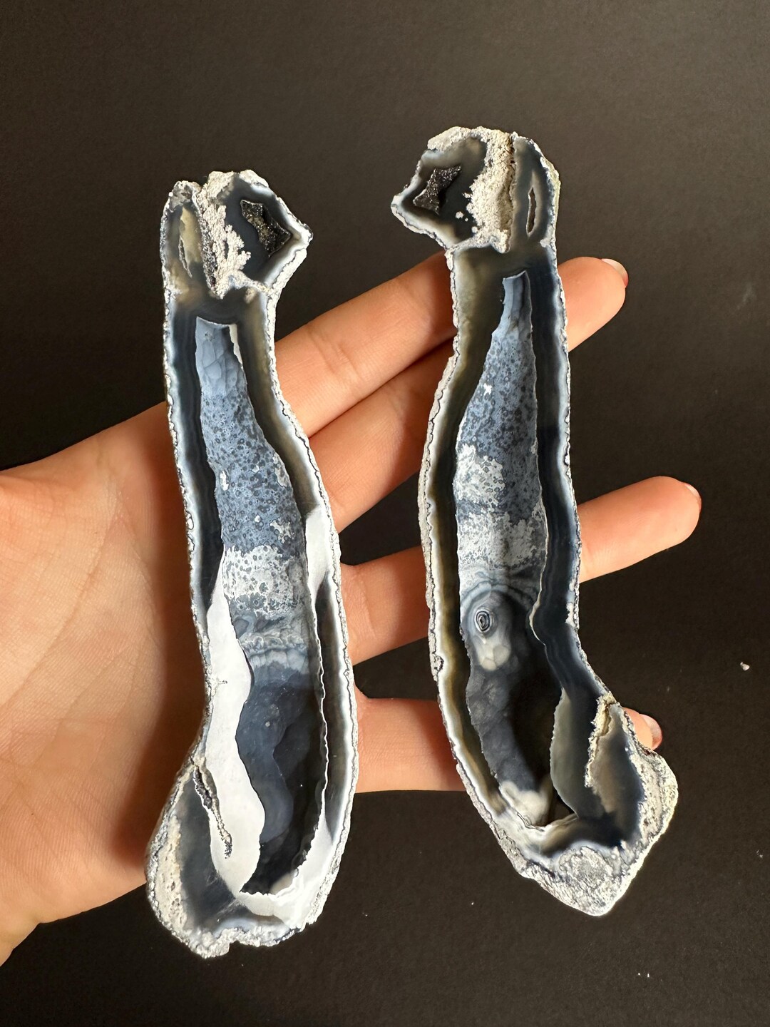Agatized Fossil Coral Finger Geode Pair Rare Black/blue Color Cut ...