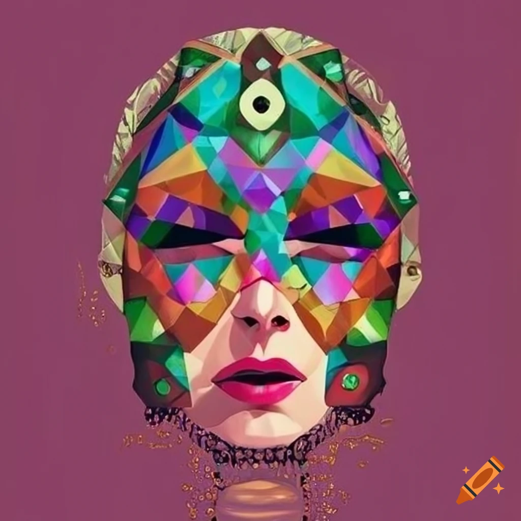 Beautiful geometric ethnic mask resembling Róisín Murphy with gemstones ...