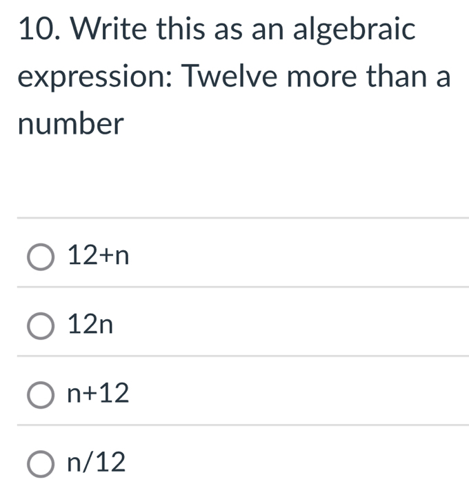 Solved: Write this as an algebraic expression: Twelve more than a ...