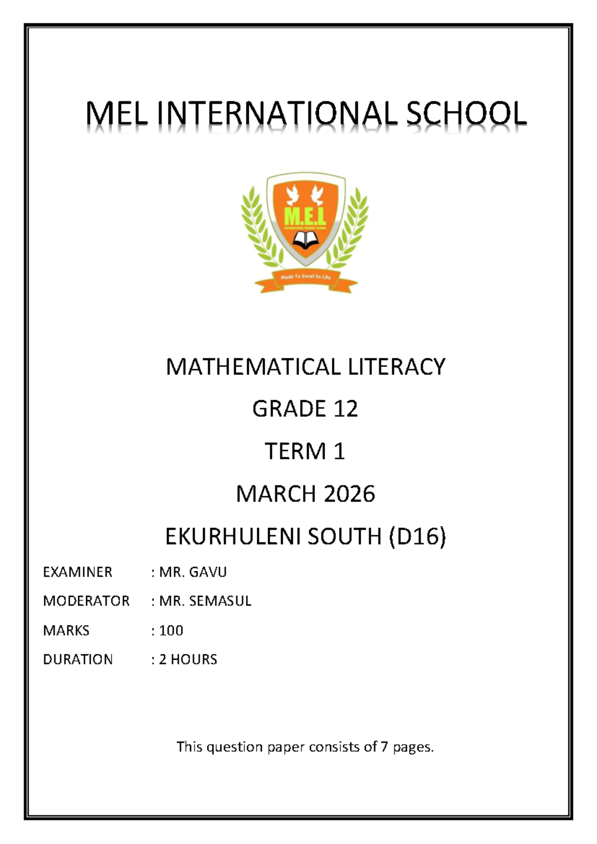 MEL INTERNATIONAL SCHOOL GRADE 12 MATH LITERACY TERM 1 EXAM 2026 - Studocu