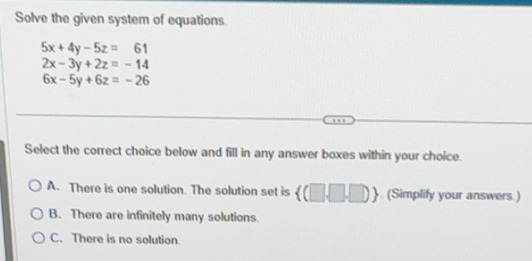 Solved: Solve the given system of equations. 5x+4y-5z=61 2x-3y+2z=-14 ...