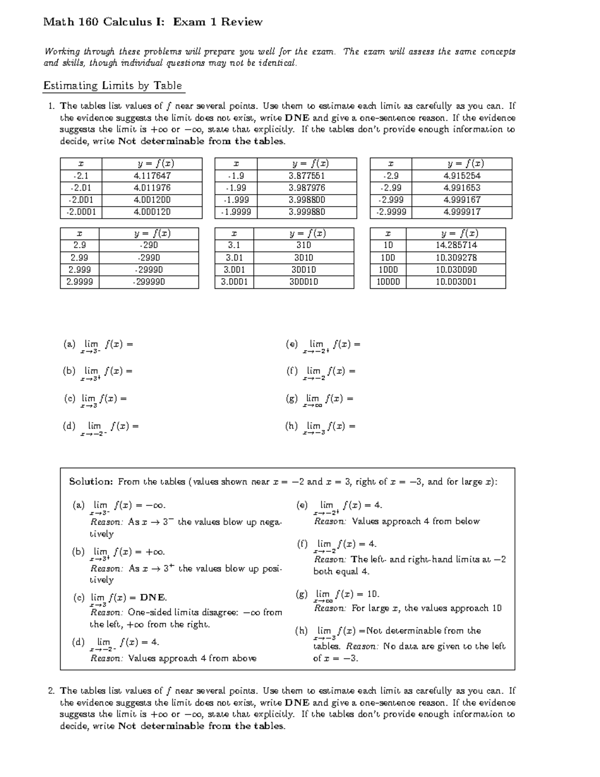 Math 160 Calculus I: Exam 1 Review Solutions and Limit Estimations ...
