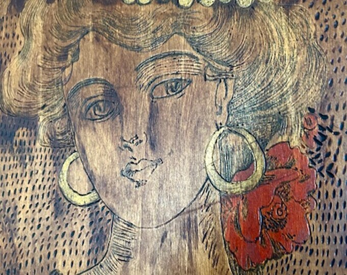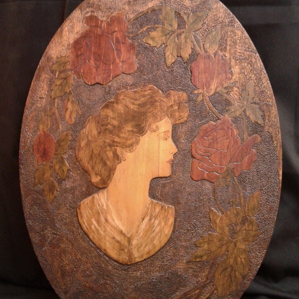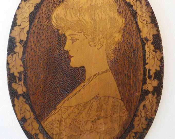 Antique Wood Pyrography Plaque Flemish Art Gibson Girl Bohemian Woman ...