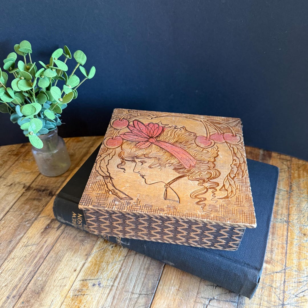 Antique Wood Burned Box with Gibson Girl and Cherries. Pyrography Folk ...