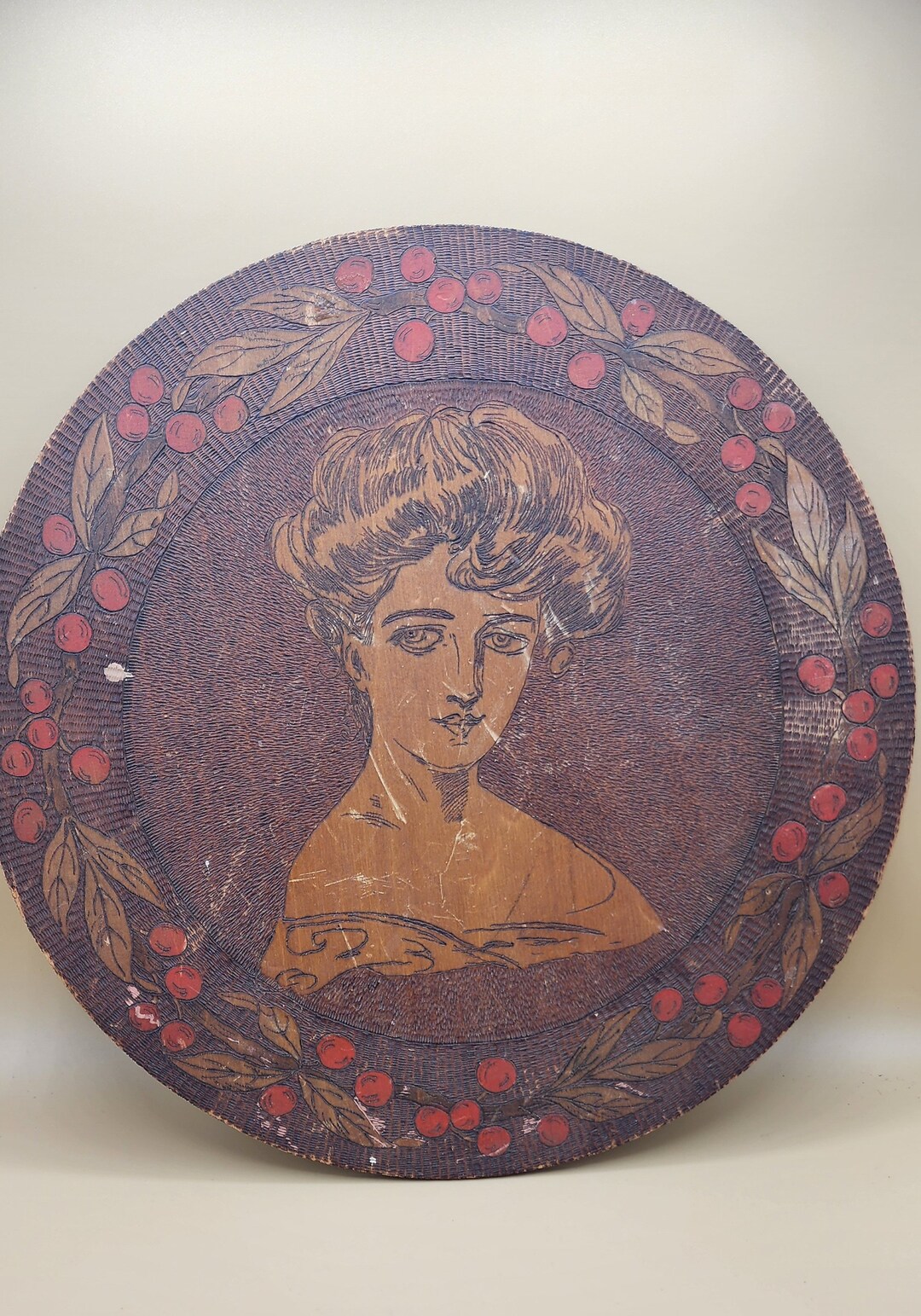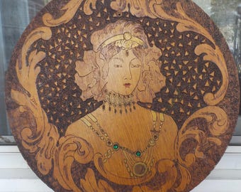 Vintage Gibson Girl Art Nouveau wood Pyrography Round Wall Plate, 15 ...