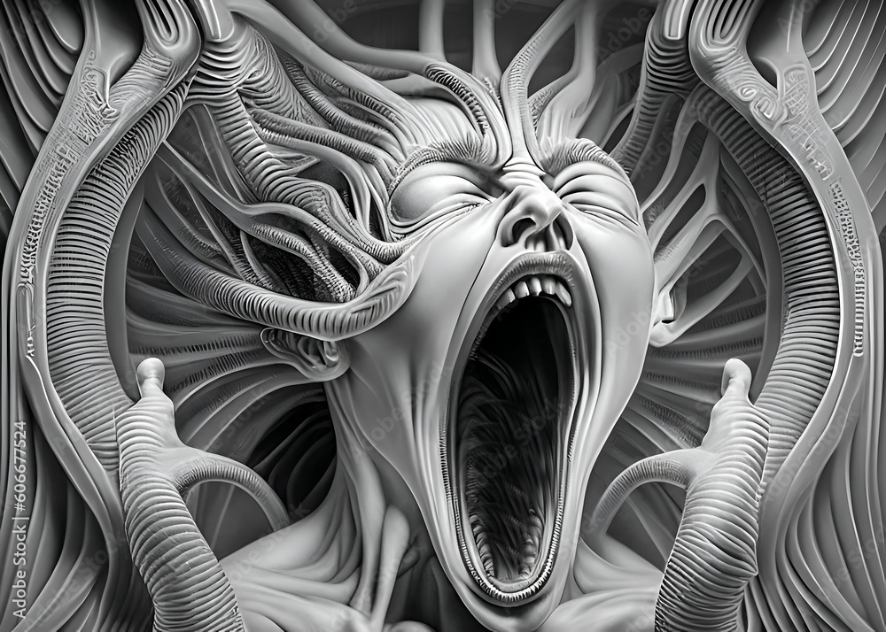 " @aw Horror, dark black psychedelic, H.R.Giger-esque dystopian alien ...