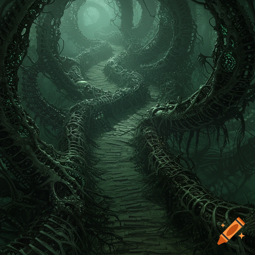 A winding, dark, biomechanical path through a misty, overgrown forest ...