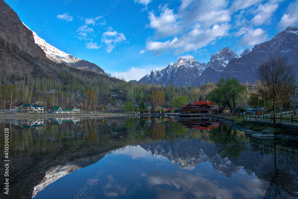 A beautiful landscape with a lake and snowy mountains in northern areas ...