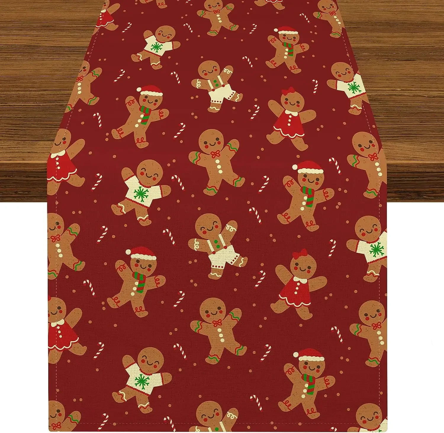 Christmas Gingerbread Man Linen Table Runner Holiday Party Decor Winter ...