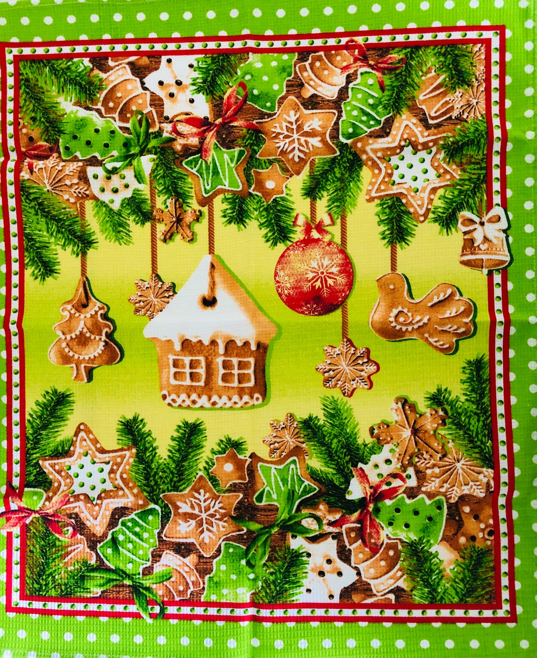 CHRISTMAS GINGERBREAD HOUSE, Cotton Kitchen Dish Tea Towel, Green Red ...