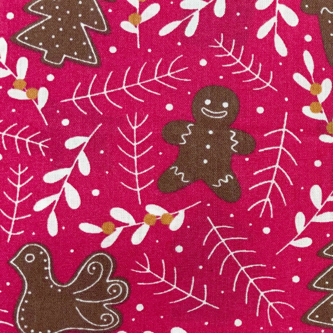 Christmas Fabric Gingerbread Men House Tree Star on Pink Polycotton ...
