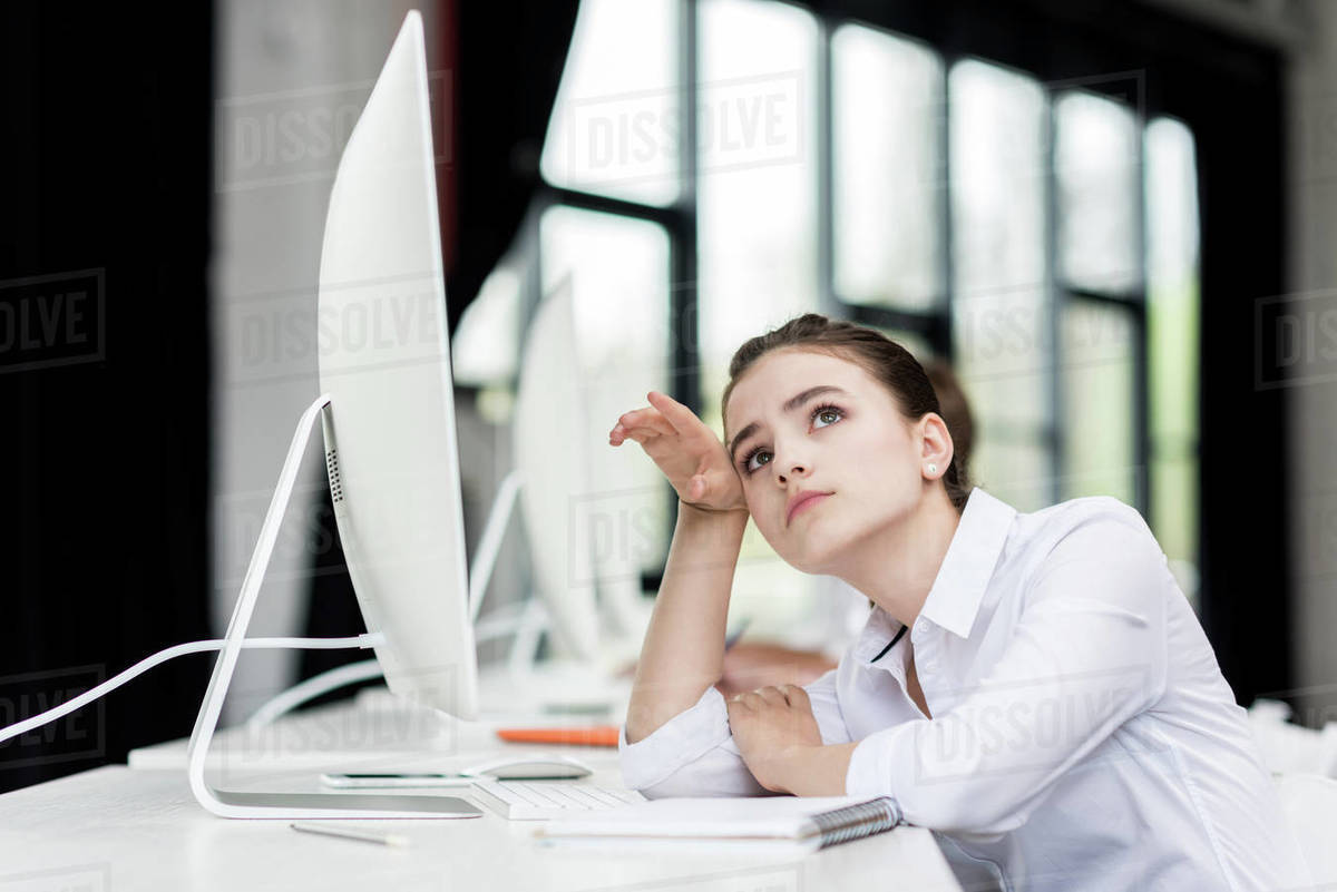 Premium Photo | Thoughtful girl using computer while sitting on table