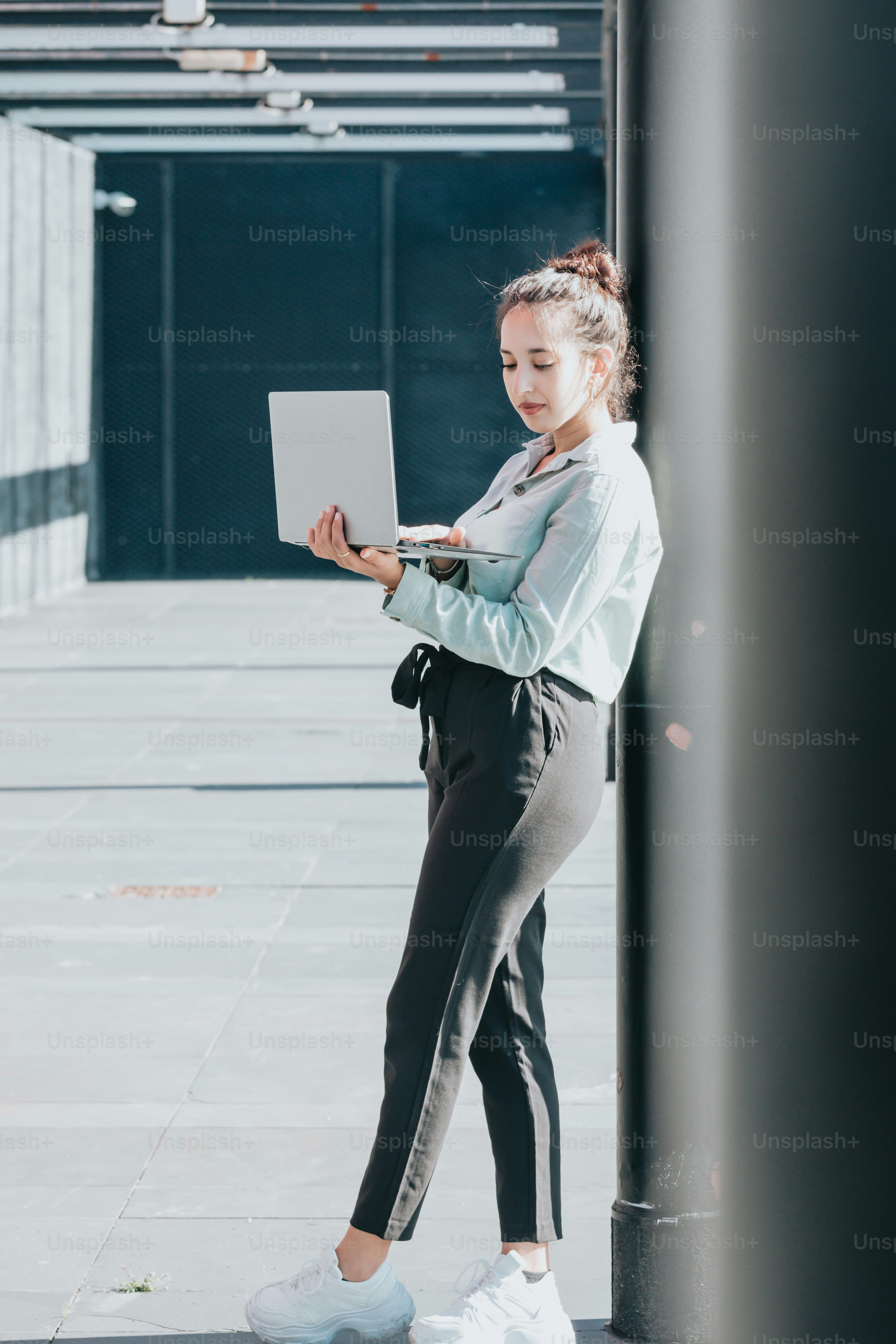 A woman standing on a sidewalk using a laptop computer photo – Woman ...