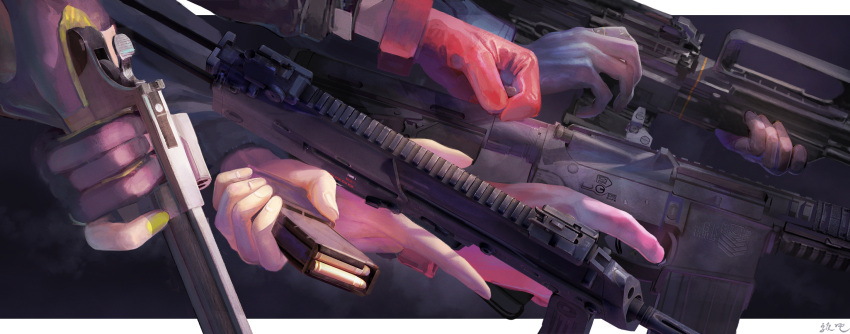 Safebooru - 4girls ar-15 assault rifle colt python commentary request ...