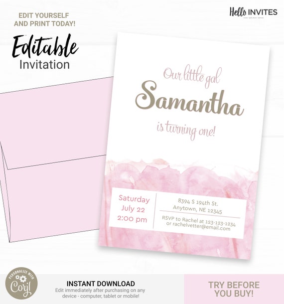 Pink Watercolor Birthday Invitation - Instant Access Edit Now - Modern ...