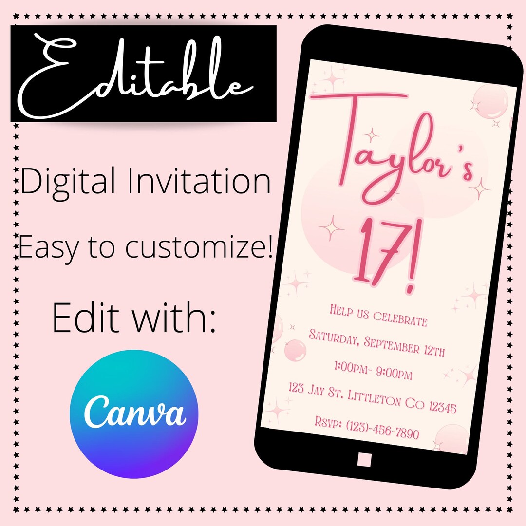 Birthday Editable Invitations, Digital Invites, Girly Pink Invites ...
