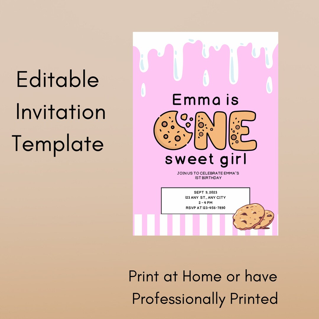 Editable Invitation Template Girl First Birthday Milk and Cookies One ...