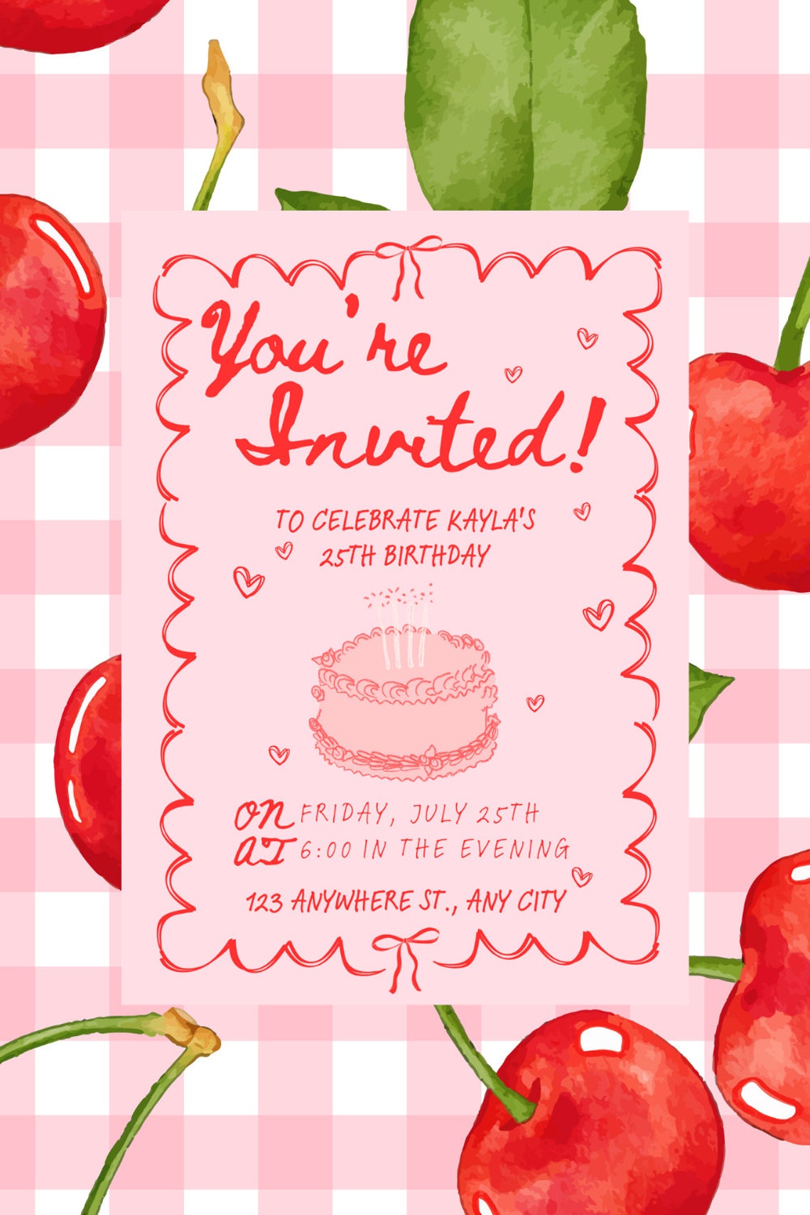 Pink Ribbon Cherry Minimal Birthday Invitation Template | Coquette Two ...